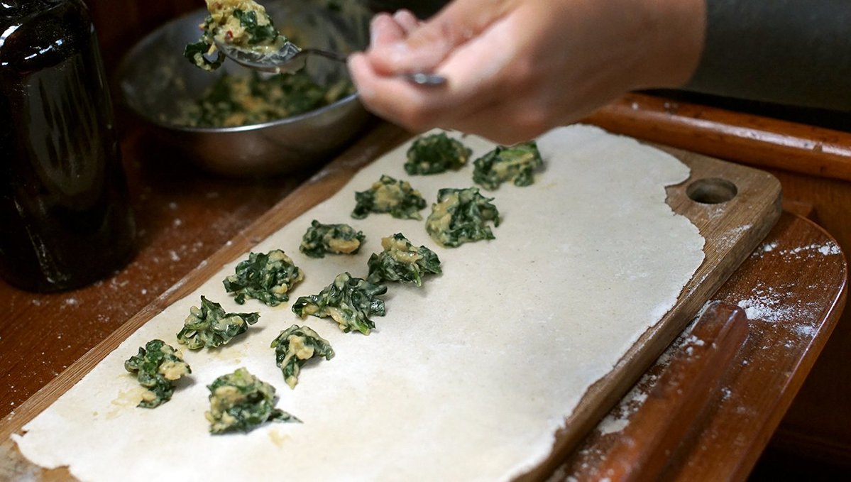 Making the ravioli is easy, and requires laying out a thin sheet of dough, and adding bits of the spinach and cheese mix into separate small mounds across. Leaving enough space between each 'mound' is necessary, as another sheet of dough is laid overtop and that the space ensures that both sheets will stick together.