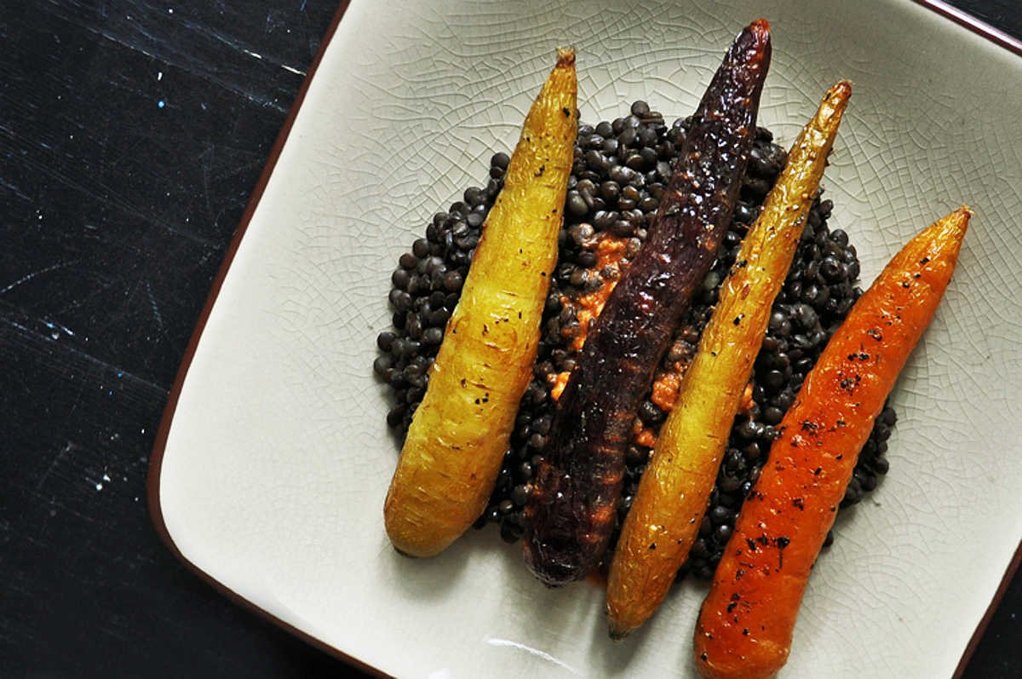 - Set the beluga lentils on a plate with a bit of sauce and top with 4 roasted carrots!