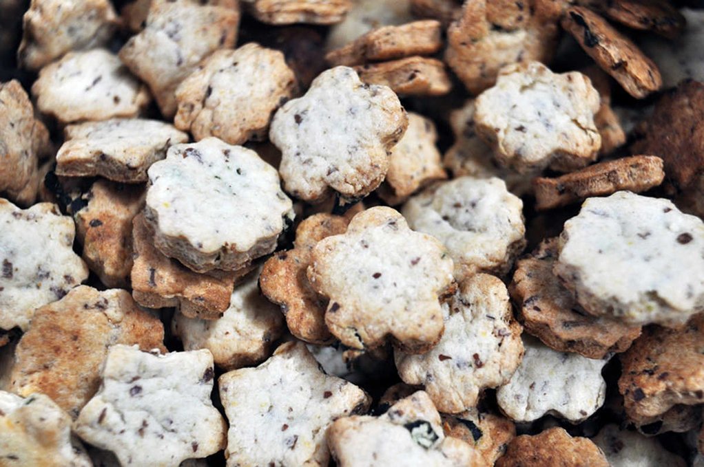 We used our fancy cookie cutters, but most times we just cut the sheets of dough into small squares with a regular knife. Using cookie cutters is longer, because we want to use every bit of the dough and that means re-using the bits around the cut-outs.